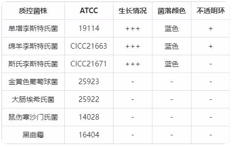 单增李斯特氏菌36±1℃培养24-28小时,平板上出现蓝色菌落,菌落周围有一不透明环。绵羊李斯特氏菌36±1℃培养48小时,平板上出现蓝色菌落,菌落周围有一不透明环。斯氏李斯特氏菌36±1℃培养24-48小时,平板上出现蓝色菌落,菌落周围没有不透明环。在食品检测中绵羊李斯特氏菌非常少见。