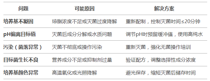 培养基的制备与使用需严格遵循标准化流程,从配方选择、灭菌控制到质量验证环环相扣。实验室人员应掌握常见问题的快速诊断与处理技能,并定期开展培养基性能验证,确保检测结果的准确性和可重复性。通过优化制备工艺和加强操作规范,可显著提升微生物检测效率与可靠性。