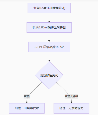 指示系统:溴甲酚紫(1.4 ml/ L)作为pH指示剂,发酵产酸时由紫色变黄色(阳性),无变化则保持紫色(阴性)。