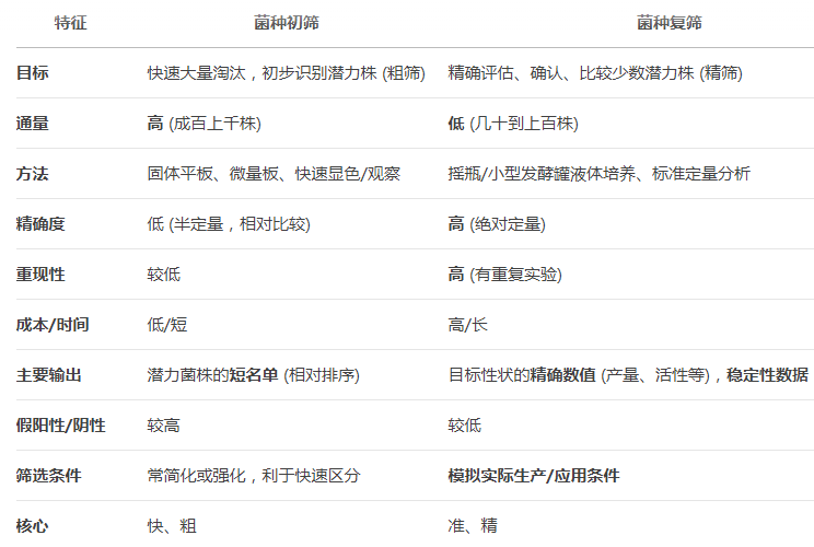 初筛是漏斗的宽口,复筛是漏斗的细颈:初筛负责处理大量样本,快速缩小范围;复筛负责在缩小的范围内进行深度分析和验证,确保选出的菌株真正满足要求。