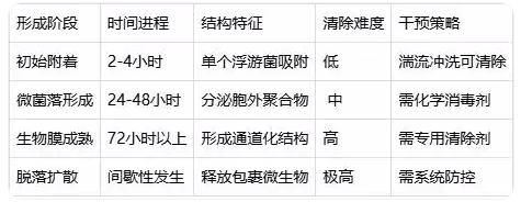 初始附着(0-24h):浮游菌吸附于管道粗糙处