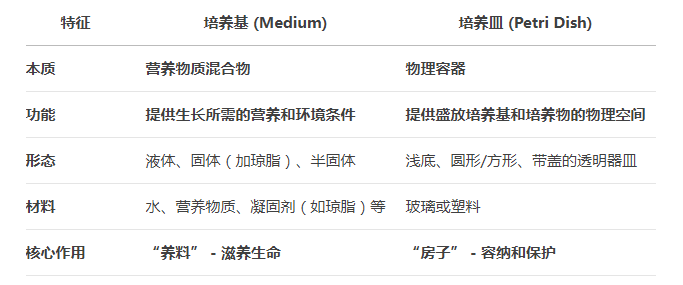 培养基和培养皿是微生物学、细胞生物学等实验中最基础也是最重要的工具,但它们的功能和本质完全不同: