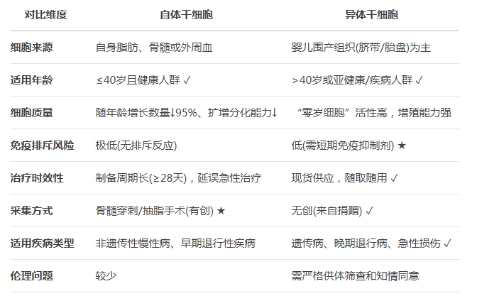 二、自体 vs 异体干细胞:关键对比